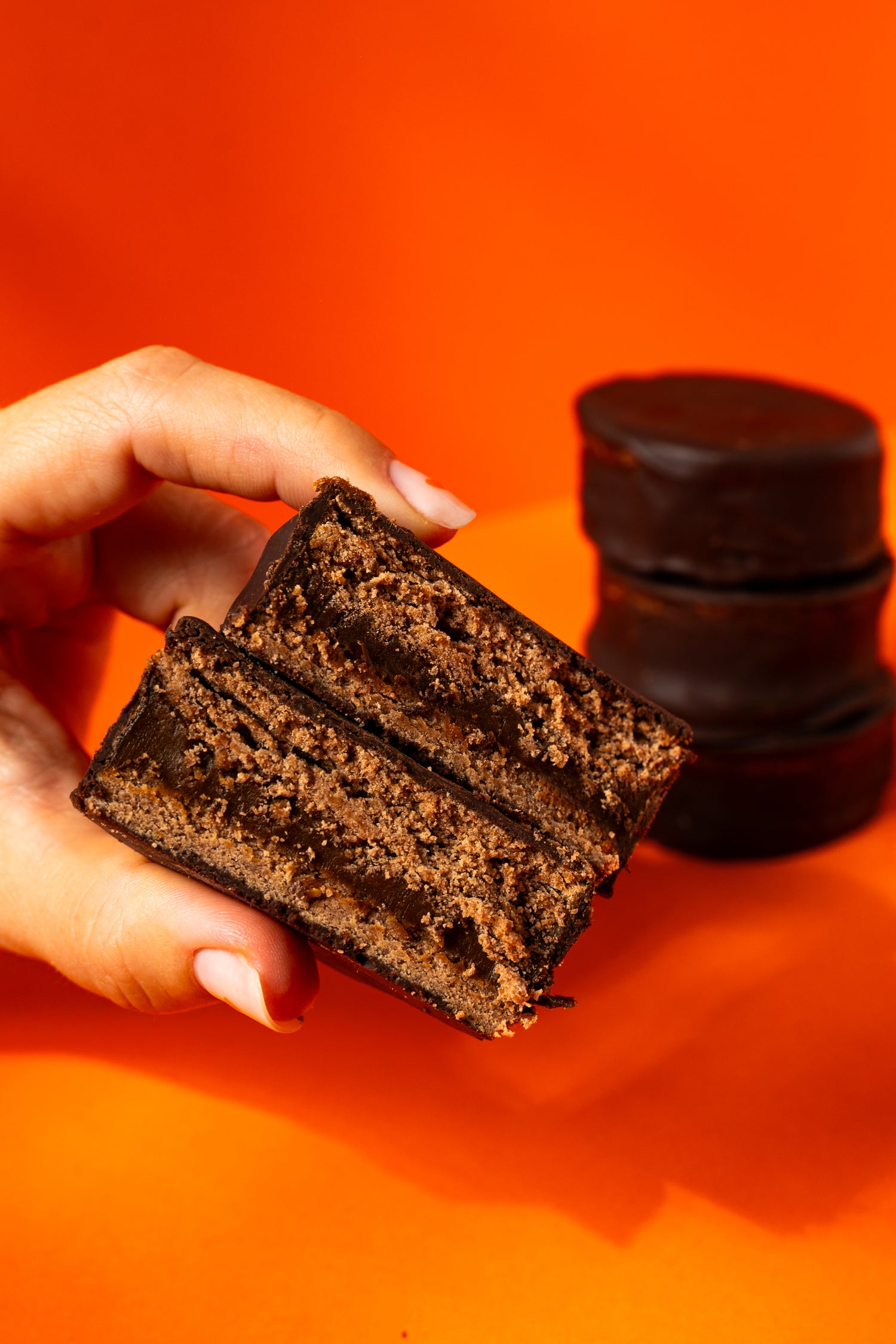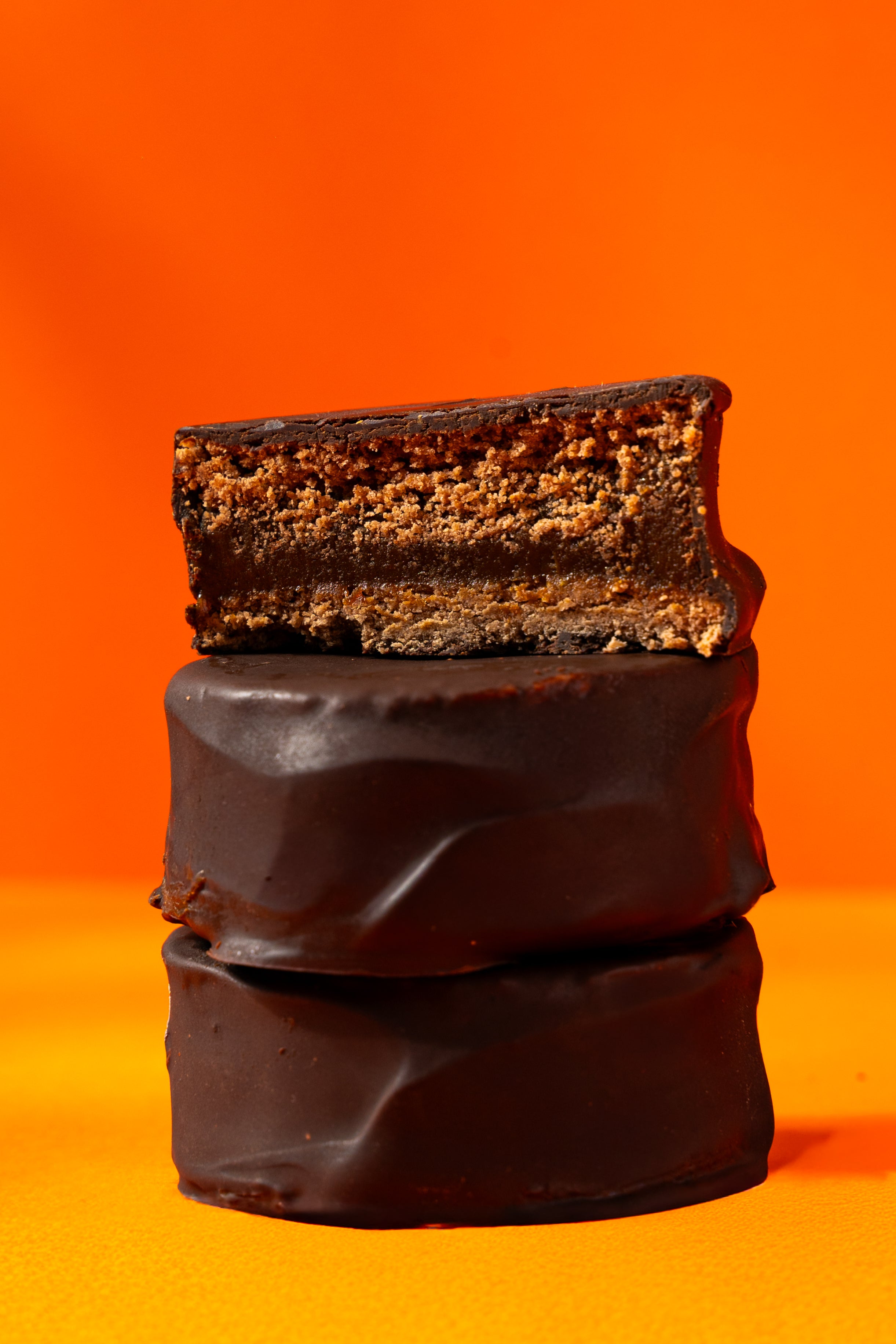 Galleta de cacao con toque de naranja, rellena de dulce de leche y cubierta de chocolate.