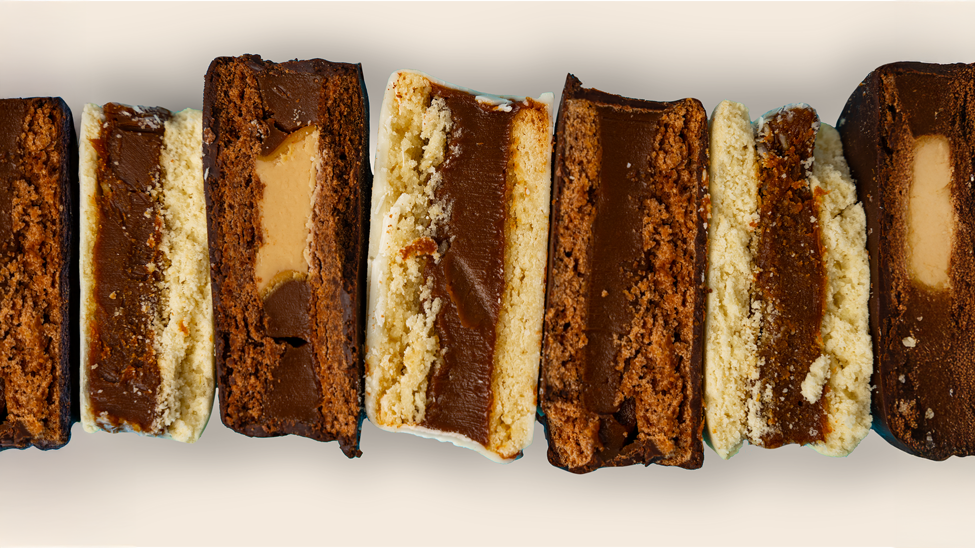 Galleta de chocolate con toque de naranja, rellena de crema Kinder y dulce de leche, cubierta de chocolate.